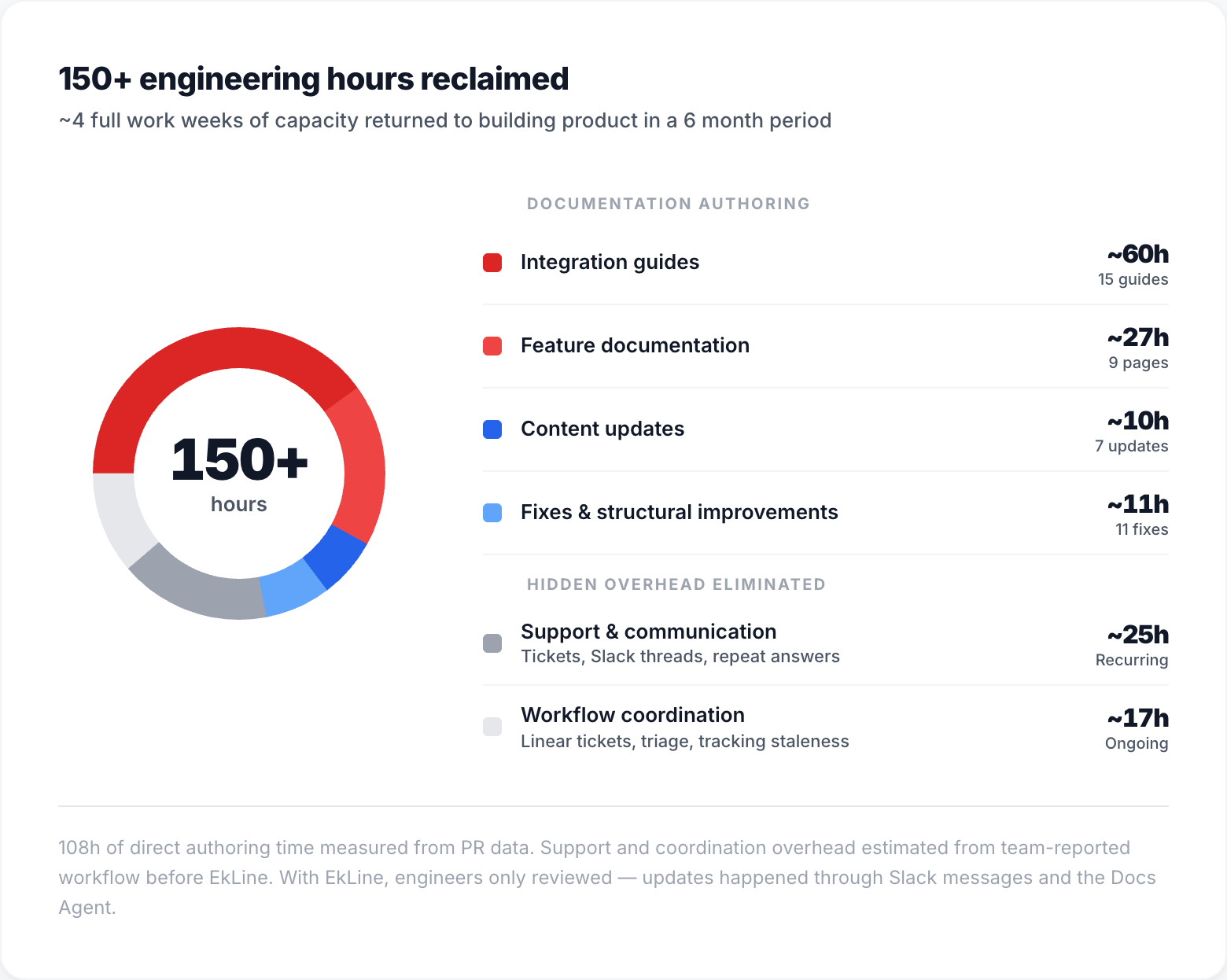 The result: Over 150 engineering hours reclaimed, roughly 3 full work weeks redirected back to building product. At $150 to $195 per hour, that represents $22,500 to $29,250 in reclaimed engineering capacity.