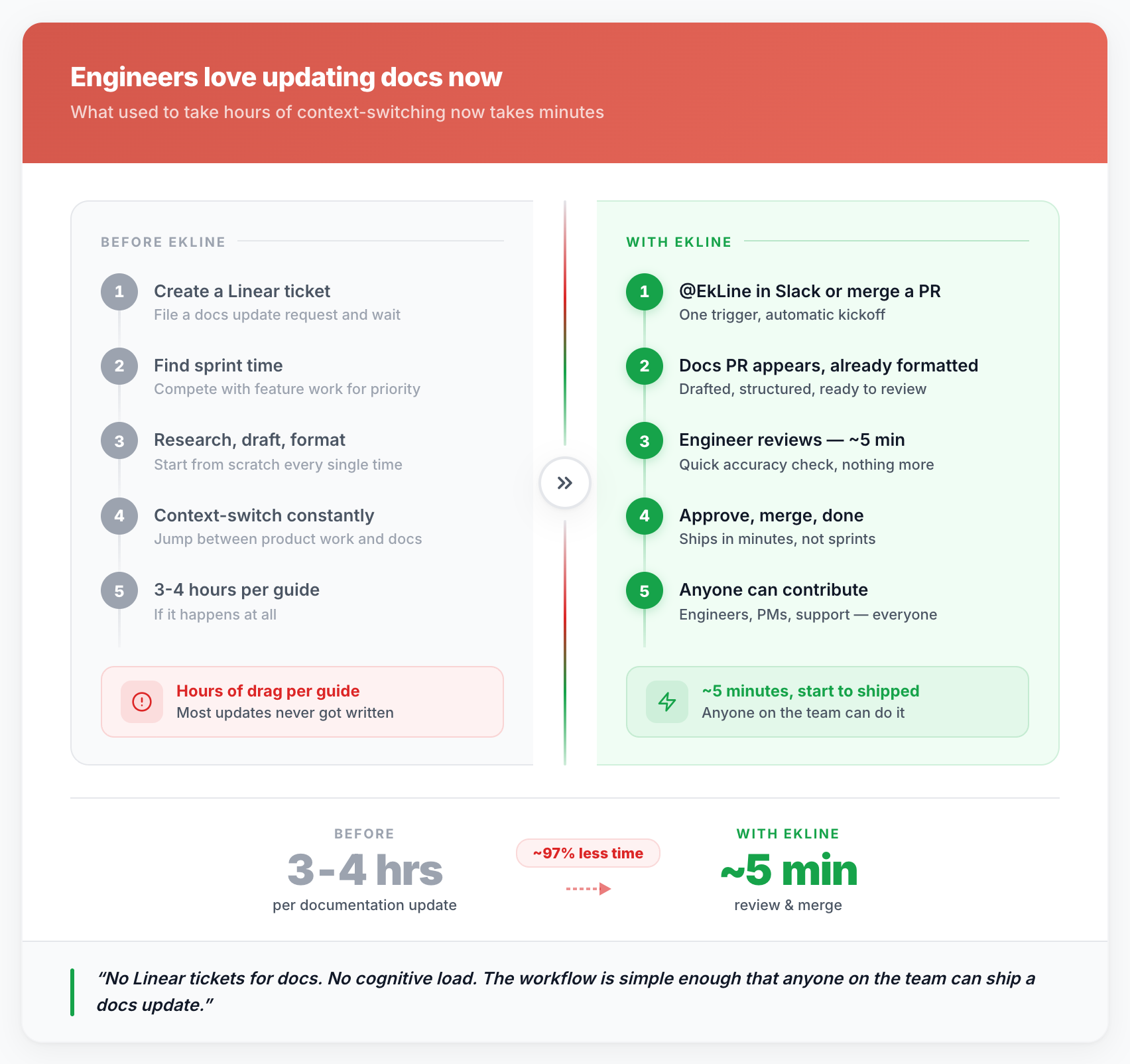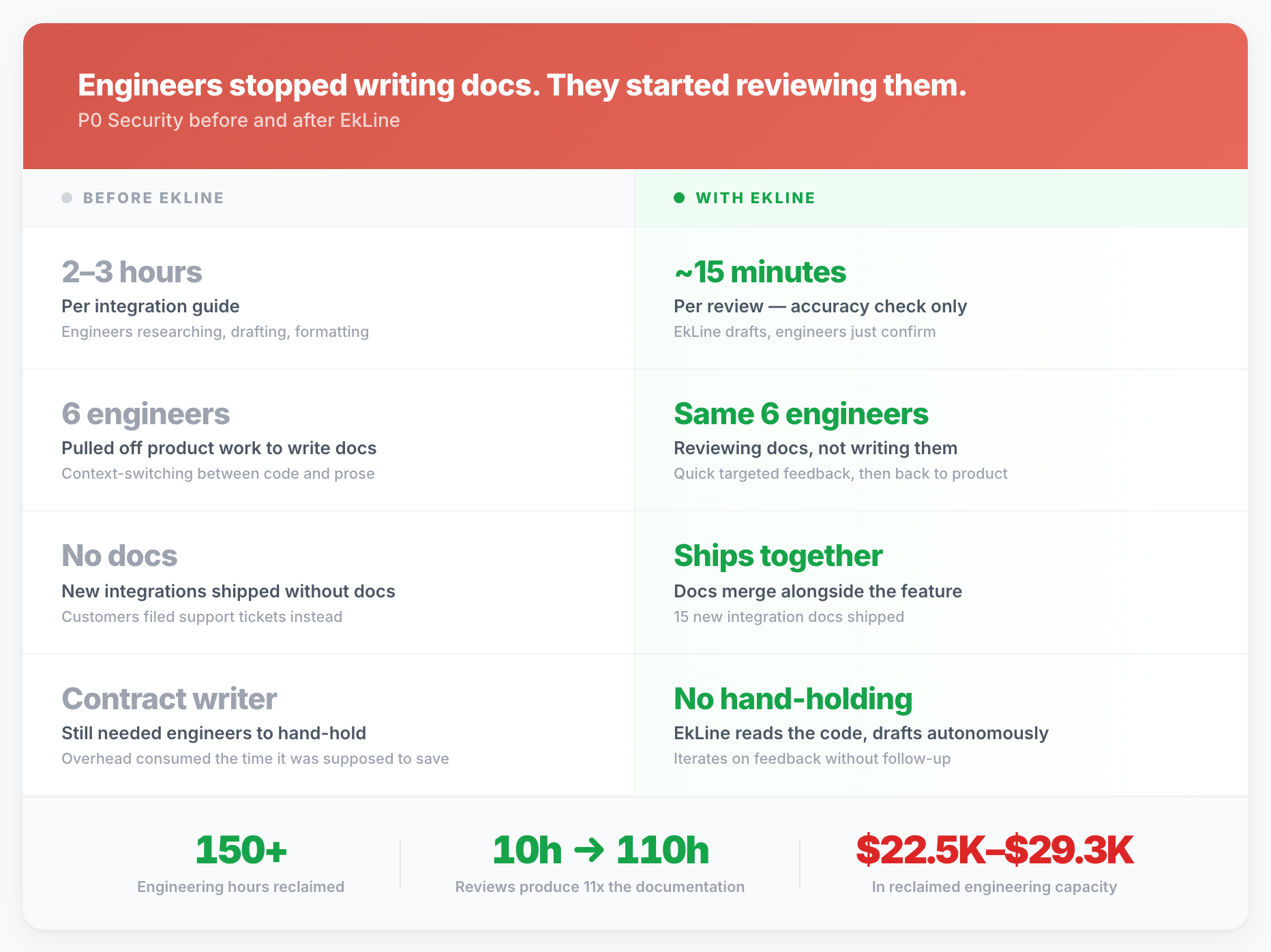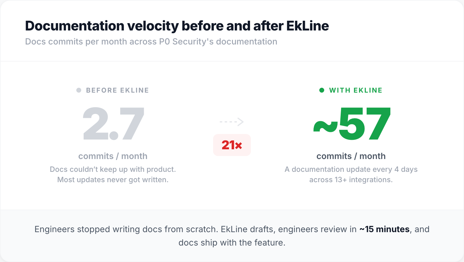 The moment the team realized EkLine was different from a contract writer or an internal docs push: engineers weren't writing docs anymore. They were reviewing them.