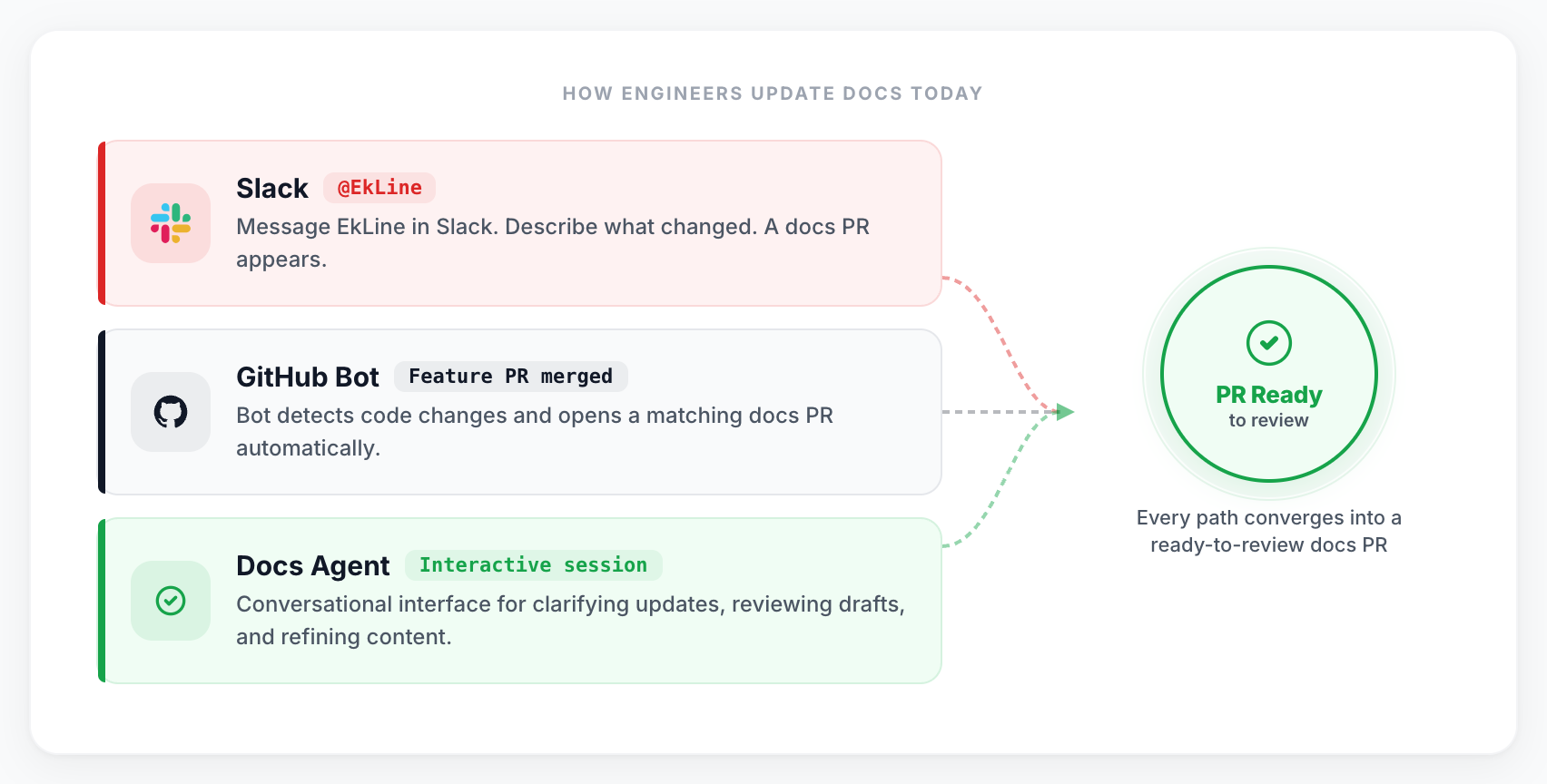 Here's how it works: EkLine creates documentation PRs alongside engineers' feature work. As the feature PR evolves, the docs PR updates with it. By the time a feature is ready to merge, the documentation is already drafted, reviewed by automated quality checks, and waiting for a final engineer sign-off. Documentation ships with the feature, not weeks after.